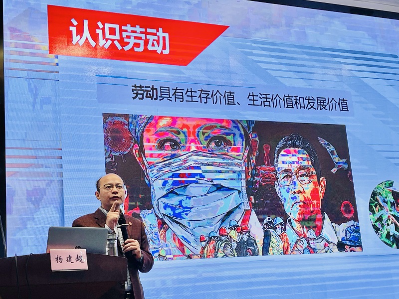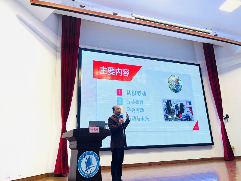 杨院长首先以三位历史名人的经典语句以及习近平总书记的讲话,引出“劳动”这一关键词,强调劳动在人生中的重要性。他从认识劳动、劳动教育、学会劳动和劳动与未来4个方面对劳动的概念进行解读,寄语同学们要脚踏实地,只有从一根线、一粒米的小事做起,由近及远,由小及大,成长的基石才能一层层夯实,人生的扣子才能一粒粒扣紧,才能实现个人未来的有效发展。