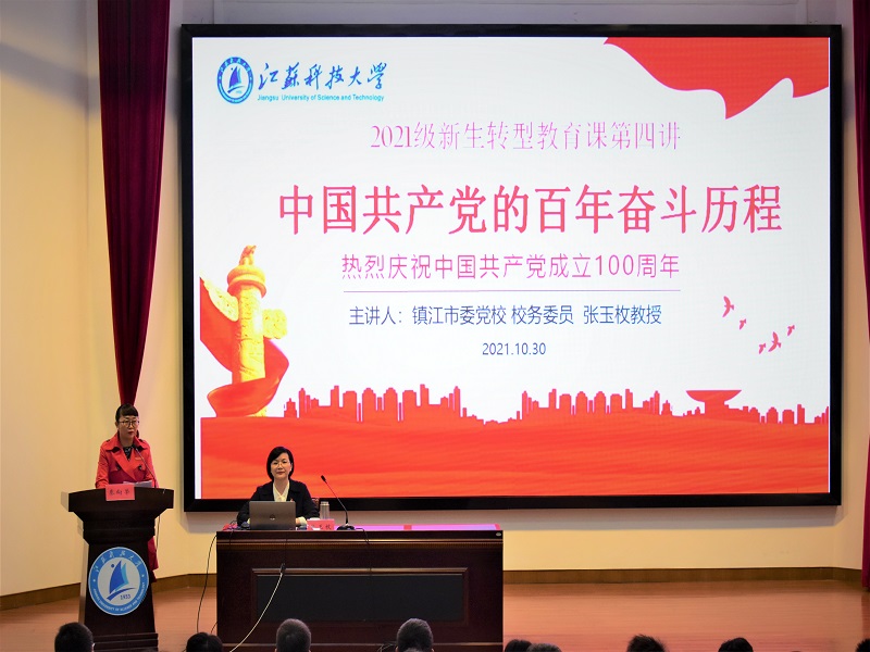 为使2021级新生们对中国共产党有更深入地认识,进一步提升青年大学生的政治素养,10月30日上午,深蓝学院邀请镇江市省委党校校务委员张玉枚教授以“中国共产党的百年奋斗历程”为题,在梦溪校区演讲厅开讲新生转型教育第四课。讲座由深蓝学院党总支副书记秦向荣主持,深蓝学院300余名21级新生在演讲厅聆听讲座,4500余名学生通过网络直播同步听取了讲座。